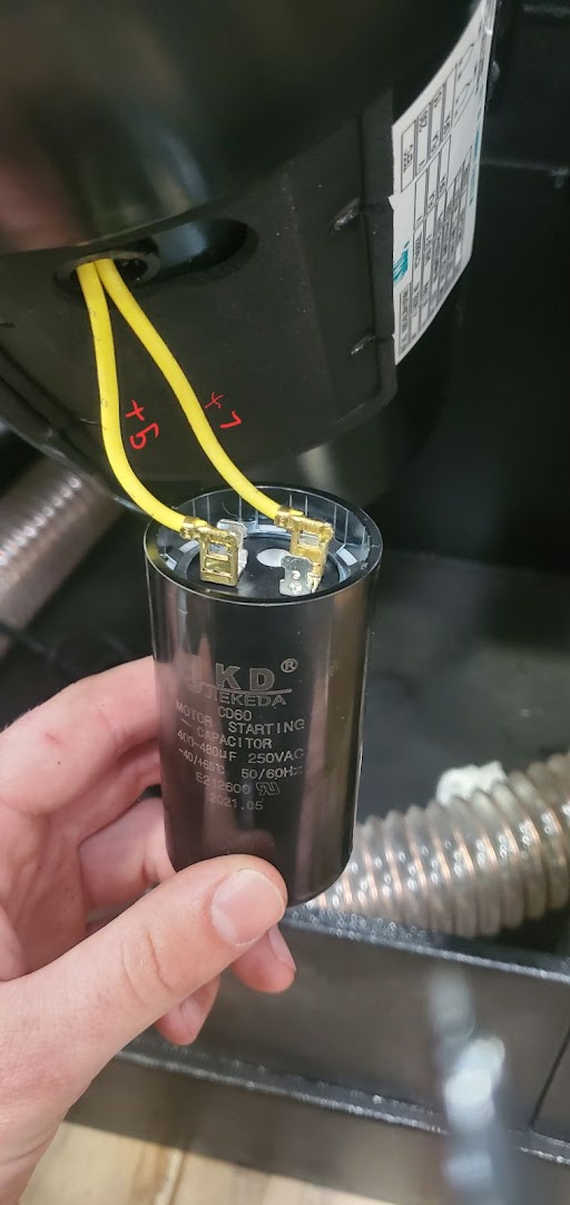 The new capacitors will be labeled as start and run capacitors and will be of different physical sizes. When installing both the run and start capacitors, connect the wire connections to each tine on the capacitor on the same sides that they were installed from the factory, using the labeling on the capacitor as a left-to-right reference.