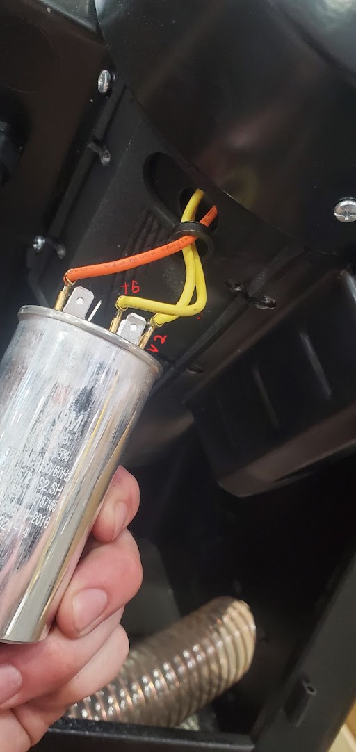 Once the capacitor is out of the cover, remove the connectors from the capacitor. This may be easier to do by using a pair of pliers to pull the wire connections from the two capacitor tines/prongs.