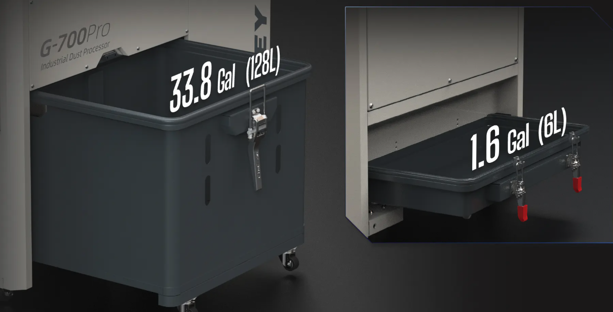 The G700 PRO’s main bin is slightly larger in raw volume, mainly due to its shorter overall height and wider body design. In real-world use, both bins offer generous chip capacity suitable for planers, jointers, and table saws producing heavy, bulky debris.