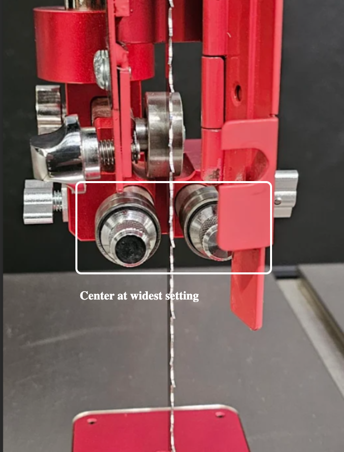 5. When done, loosen the lock nuts for the bearing shafts and rotate them outwards from the blade slightly and confirm that the gaps are even front to back on both sides. You should have a setup where the blade is centered to both the thrust and guide bearings and even gaps front to back between the guide bearings and the blade.